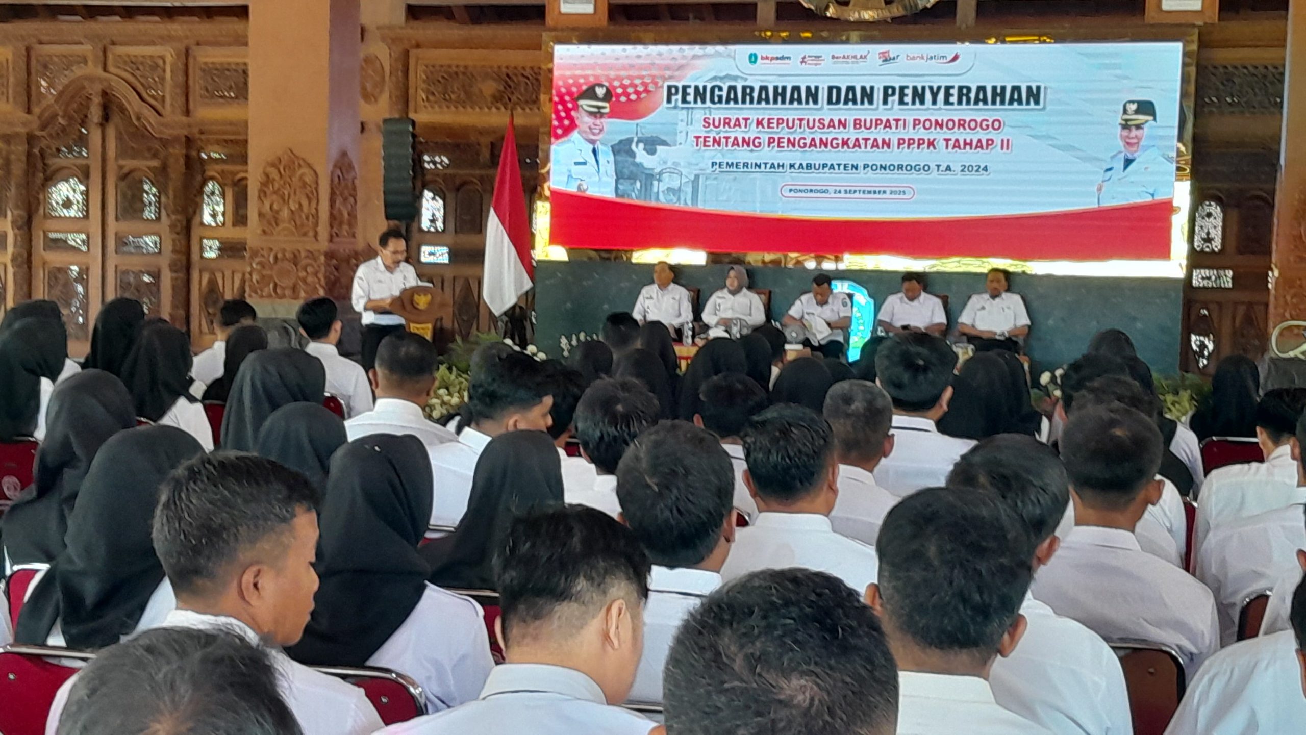 bintangpena.com -Ponorogo- Sebanyak 241 Pegawai Pemerintah dengan Perjanjian Kerja (PPPK) hasil rekrutmen tahap 2 tahun 2024 menerima Surat Keputusan (SK) pengangkatan. SK diserahkan Bupati Ponorogo Sugiri Sancoko bersama jajaran, Rabu (23/9/2025) di pendapa kabupaten setempat.